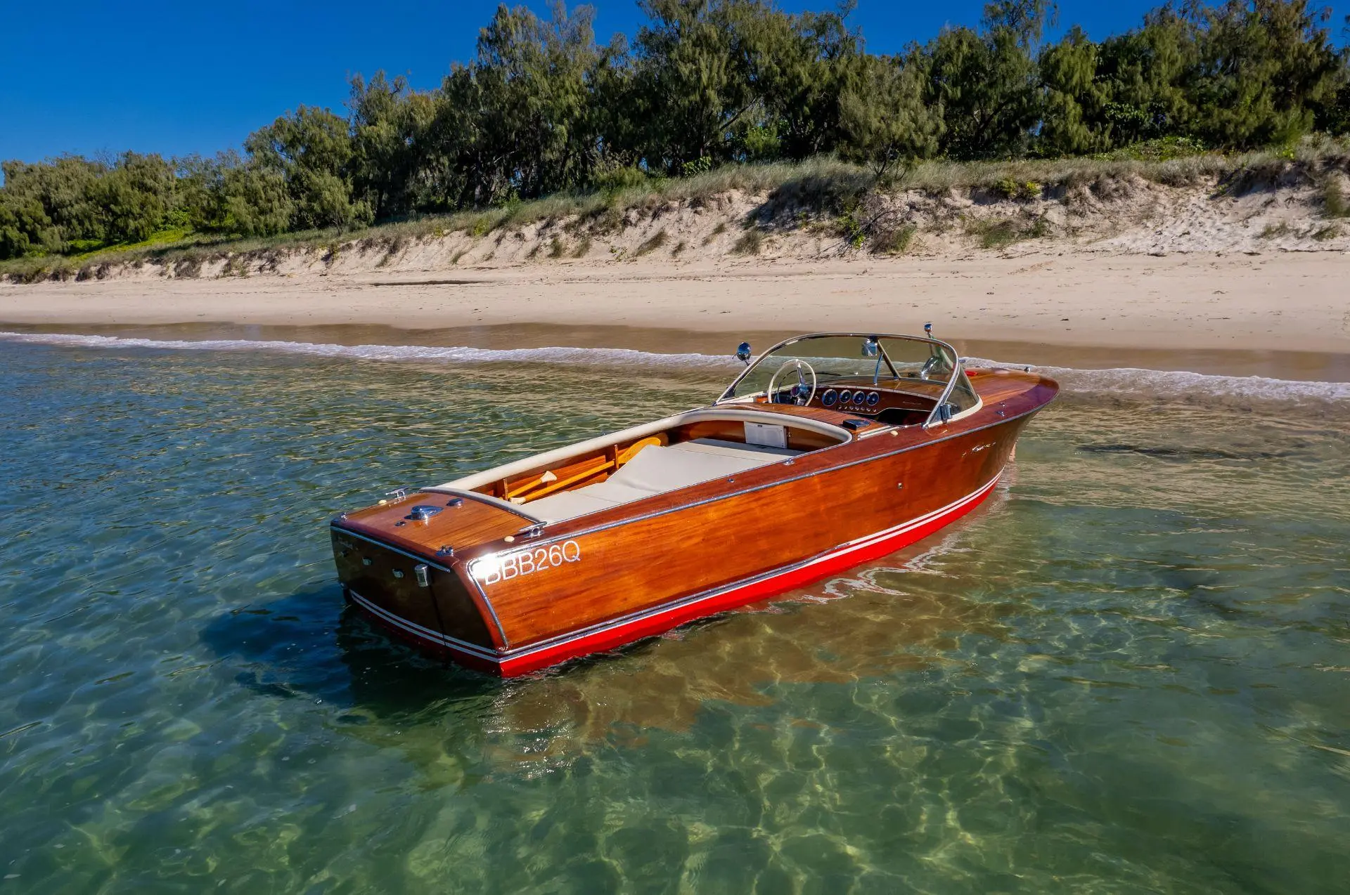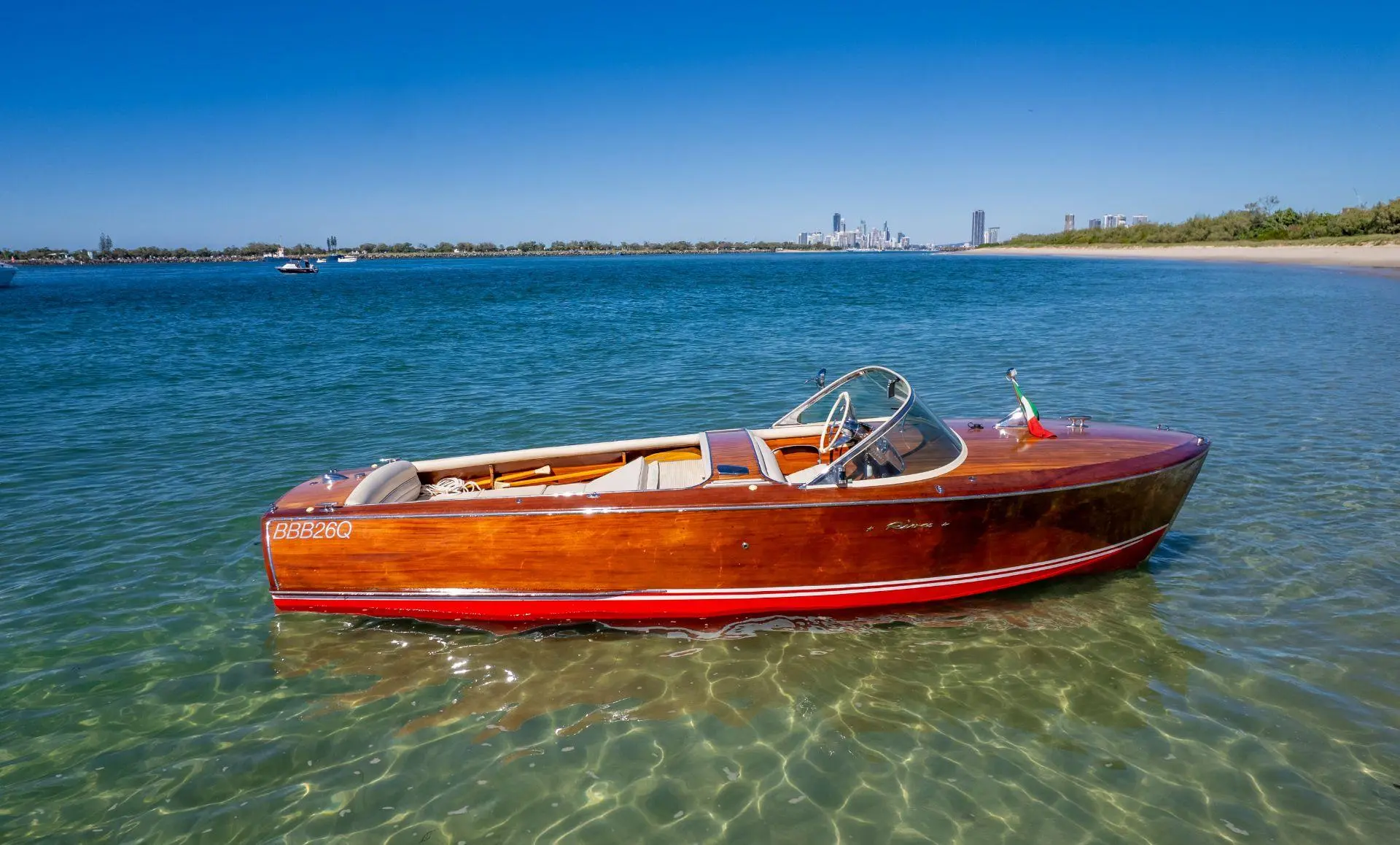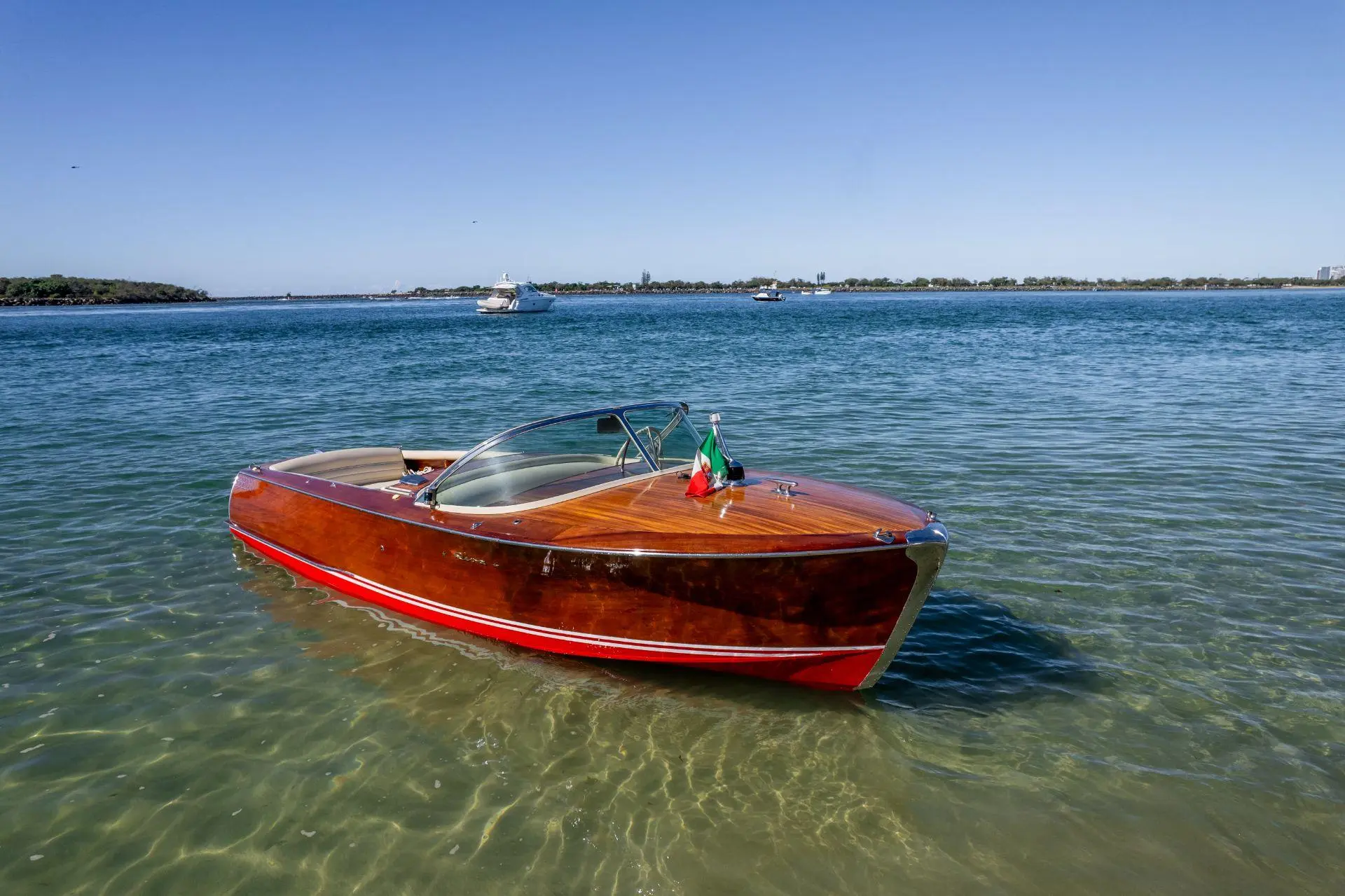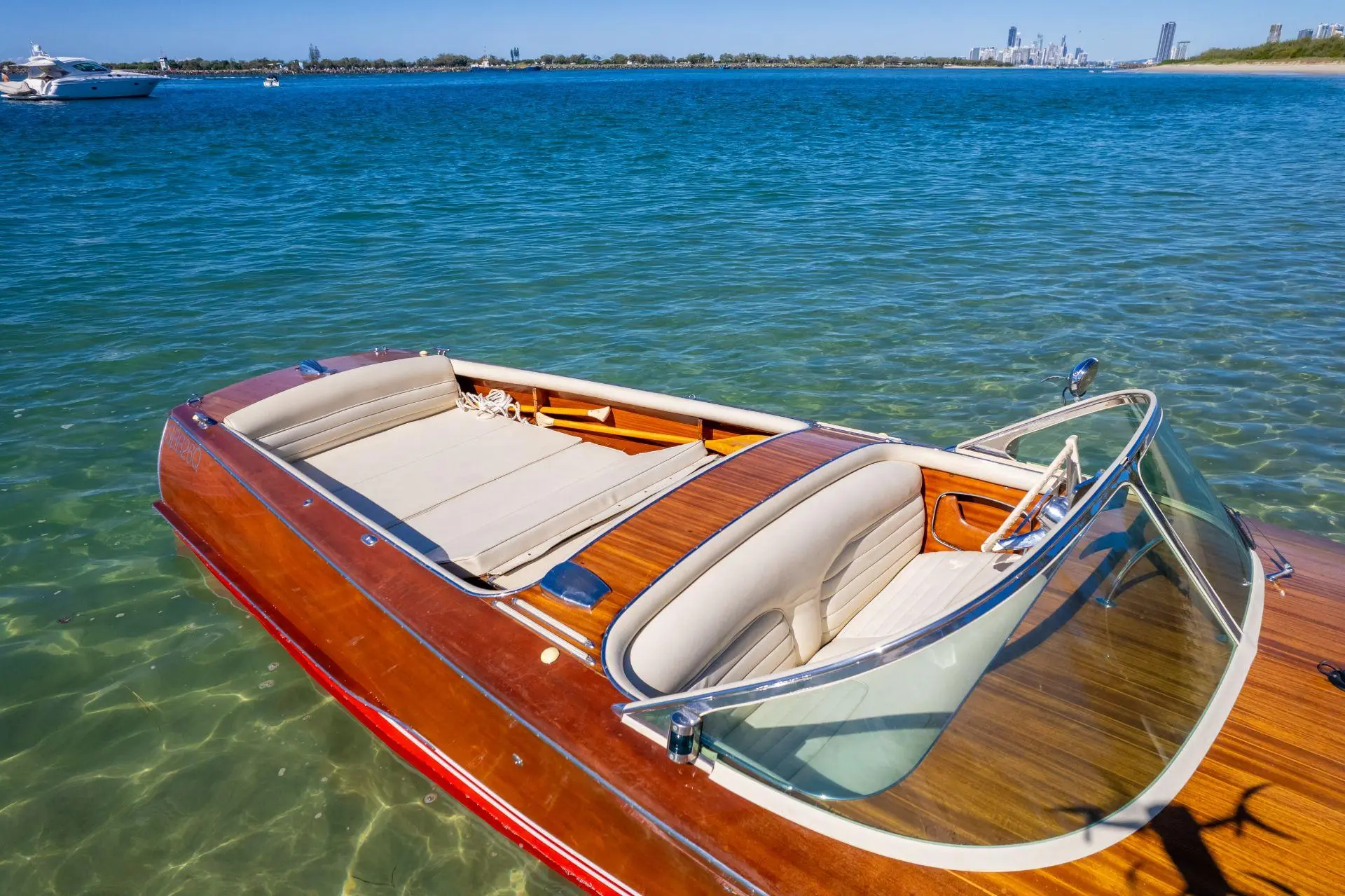 Le Riva Super Florida est un bateau classique de 6,10 m construit en bois d’acajou avec une finition brillante. Propulsé par un moteur Chrysler V8 de 177 chevaux, il atteint une vitesse maximale d’environ 35 nœuds. Connu pour son design élégant et sa qualité artisanale, il incarne le luxe et le charme des années 1960.